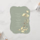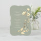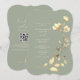 Denna unikt formade bröllopsinbjudan har en mjuk sagegrön bakgrund med handmålade gyllene vildblommor och botaniska accenter. Romantisk kalligrafi och en boho-inspirerad layout gör den perfekt för rustika, trädgårds- eller eleganta utomhusbröllop.