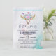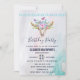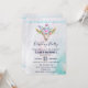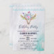 Ett födelsedagsfest inbjudan med turkos- och pastellbakgrund. En boho chic skalle med en blommigt buquet på huvudet och små fjärilar som flödar omkring. En söt dekorativ gräns med små droppformer i ljusblå blått.