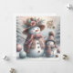 Förstör kallet genom att skicka en varm boho jul snö och barn hälsning. Snö-kvinnan är klädd i en rosa, tårblått och ljumhalm och vacker halmhatt i blommigt. Barnet har liknande hatt och halsduk i färg sticka. Hälsning kommer säkert att värma vissa hjärtan. Mallar som finns på baksidan och en "God jul" på baksidan.