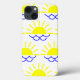 Telefonväskan har en Boho-design med halva cirklar med linjer för att göra en sol och kammussla för att göra vatten.