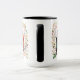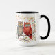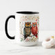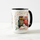 Vid detta unika mugg, två uggla med boho stil mönster, tillsammans på träd gren. Ett uggla är grönt och guld, det andra uggla är rött/orange och guld. De omges av guld och grönt höst löv. Bilden skrivs ut två gånger på mugg.