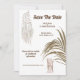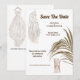 Två trästolar draperade med mjuk chiffong och bundna baktill ramas in av ett stort blad. En snygg vit drömmfångare med flätad spets och långa hängande fjädrar syns i det övre vänstra hörnet och textmallar för din kommande vigsel syns mellan de eleganta illustrationerna. En vacker lång och flytande brudklänning hänger på en galge baktill. Dessa minimalistiska men ändå lyxiga inbjudningar är perfekta för bröllop med tema strand, sommar, afrikansk safari, djungel, friluftsliv och skog.