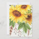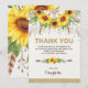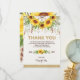 Vacker boho-inspirerad tack-kort med rustika vattenfärgssolrosor, fjädrar och gröna blad fästa vid en drömmfångare