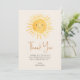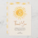 Detta sol-tema baby shower tack-kort har en söt gul leende sol och stilren script typografi på en krämfärgad bakgrund. Baksidan är dekorerad med ett solmönster. Lätt att anpassa. Original Watercolor © Michele Davies.