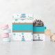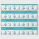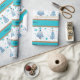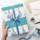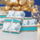 Boho Teal Blue Julgran som omsluter pappert har två moderna stilar av dekorerad Julgranar omgiven av tårblåa snö flingor som faller. Budskapet "Lycklig-jul" på det alternerande blåa rand kan anpassas till ert eget hälsning. Ett underbart tillägg till ett blått Folky eller en boho under julen.