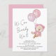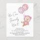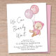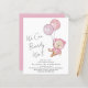 Boho budgetvänlig babyflicka bröllopsinbjudan med en söt akvarellillustration av en rosa teddybjörn som flyter med ballonger, och "Vi kan knappt vänta" i ett handskrivet kalligrafi-skrift.