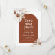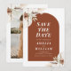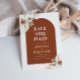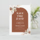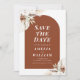 bröllop spara datum-kort med rostigton terracotta-design med blommor och vackert skript.