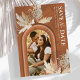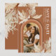 Eleganta boho bröllop spara datum-kort med ett foto av bruden och brudgummen i en jordtonad monokrom båge, akvarell öken torkade palmblad, pampasgräs och en modern mall för att spara vårt datum.