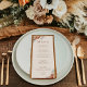 Fyll i din bröllopsduk med denna eleganta boho terrakotta meny, med en romantisk blomsterarrangemang av pampasgräs, terrakotta och beige vilda blommor, torkade palmblad och eukalyptusgrönska. Mot en varm, ljusbeige bakgrund ger designen en perfekt blandning av rustik charm och raffinerad stil.