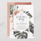 Elegant, en unik inbjudan till studentfest för blommigt med uppgifter om student namn och party omgivna av ett faux guld geometric ram, mörk grönt tropiskt löv och peonier och orkidéer. Baksidan av inbjudan har en vattenfärgsbakgrund. Designad att samordna med vår samling av tropisk Blommigt från Boho.