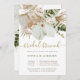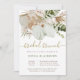 Den här inbjudan till trendig bröllop möhippa brunch innehåller vackra, tropiska blommor och handflatan, och botaniska löv och löv av grönt. Faux guld-kalligrafi lägger till en elegant, och huvudtexten är en naturlig boho-blandning av mer grönt och brun, allt på vit bakgrund. Baksidan av inbjudan innehåller mer blommigt grafik på en vit bakgrund.