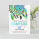 Den här "Dream big" bohemiska födelsedagsinbjudan har en ungdomlig design med lekfullt skrivstil och en turkos akvarelldrömmfångare med indianska fjädrar på vit bakgrund. Baksidan har en blå bakgrund.