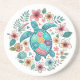 Boho Turquoise Floral Sea Turtle - Coastal Round Underlägg