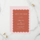 Ett modernt och snyggt bröllop spara datum-meddelande med en vågigt scallopform i terracotta med ett rosa kant med vitt teckensnitt.