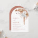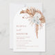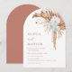 Denna eleganta moderna bröllopsinbjudan har vattenfärg målade orkidéblommor och terrakotta pampasgräs på en vit bakgrund.