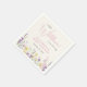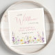 Eleganta ljuscrème servetter för babyflicka shower med "en liten vildblomma är på väg" skriven i en blandning av grå typografi och ett stilrent rosa skript, och boho-inspirerade fantasifulla akvareller av små lila, rosa och gula vildblommor. Lägg till namnet på den blivande mamman i enkla rosa bokstäver.