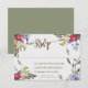 En vacker boho-vildblomsdesign på en ljusgrå bakgrund, och kompletterande salvia grön bakgrund. Använd detta koordinerande RSVP-kort för att uppmuntra dina gäster att svara snabbt! Redigera de tillgängliga textfälten för att passa dina behov, för att skapa den perfekta bröllopssviten. Andra föremål och pappersvaror i denna samling, såsom favoritklistermärken, informationskort, tabellnummer etc.! Perfekt för bröllop och shower/händelser när som helst under året, men särskilt lämpad för vår och sommar. En mycket elegant design.