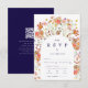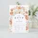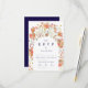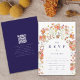 Förhöj din marinblå och vita bröllopsinbjudan med detta Boho höst rustika vildblommiga valv bröllops RSVP-bifogade kort med en skannbar QR-kod för enkel online-RSVP. Designad för att komplettera ett bohemiskt höstbröllopstema, visar detta kort handmålade akvarellblommor i rika, säsongsbetonade färger, inklusive terrakotta, kräm, bränt orange, persika, mjuk rosa, korall, gul, lila och bränd umber.