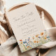 Denna rustika boho-design har en akvarellkant med orange och blå vildblommor längs botten. Orden "Spara datum" och parets namn visas i stilfullt kolgrått handskriven skrift, med återstående text i sans serif-teckensnitt på en beige bakgrund.