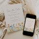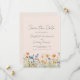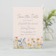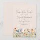 Denna rustika boho-design har en akvarellkant med orange och blå vildblommor längs nederkanten. Orden "Spara datum" och parets namn visas i stilfullt kolgrått handskriven skrift, med återstående text i sans serif-teckensnitt på en rosa bakgrund.