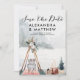 Boho Vinter Skogs Jul Foto Spara Datum - presenterar ett vackert boho skogslandskap och vacker script typografi. Brud och brudgummens foto visas på baksidan av kortet. Vår högkvalitativa mall gör det så enkelt för dig att ersätta vår text med din egen.