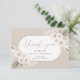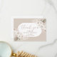 Fira bruden med detta eleganta tackkort för bröllopsfesten med en oval botanisk ram med vita akvarellblommor, palmkvistar och torkad lövverk i vita och neutrala toner som tan, beige och taupe. Med elegant handskriven kalligrafi.