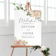 Välkomna gästerna med det här anpassadet bröllop välkomstskylten, som innehåller blommigt i vattenfärg av neutralt blommor, eucalyptus löv och faux guld-folie. Den här boho-inspirerade designen anger tonen för din bekräftelse av firande. Anpassa blommigt bröllop-tecknet med namn, händelsemedatum eller ett speciellt meddelande. Det är perfekt för ceremonientréer, mottagningar eller fotobakgrund.