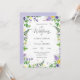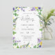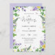 Detta är en vacker rustik och boho vildblomma tematiskt bröllopsinbjudan. Designen har en kant gjord med en mängd vårens vilda blommor, inklusive gula narcissus, lila penséer, klöver, lavendel, sötärt, maskrosor, tulpaner och ormbunks- och murgrönsgrönska.