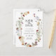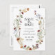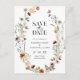 Detta stilrena & eleganta Boho White Spara Datum Postkort har vackra handmålade akvarell vilda blommor arrangerade i en vacker krans. Hitta matchande föremål i White Boho Wildflower Wedding Collection.