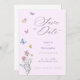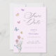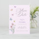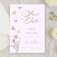 Fira din vildblomsfjäril bröllop med ett Spara datumkort som blandar boho charm med modern elegans. Den här utformningen har vattenfärgade blommigtar i lila- och lilaxskuggor och är ett uttryck för ren botanisk skönhet. Med det enkla men ändå slående skriptet anger det tonen för en dag av kärlek och glädje.