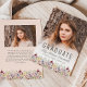 En vacker vattenfärgsfärgad blommigt gräns av vilda blommor dekorerar grund kant på det här trendiget boho studenten-meddelandekortet. På kortets framsida anpassar du grått-textöverlägget för kol på ett lodrät av graden, med student namn i handskriftsskript och skolåret och klassåret i sans serif-teckensnitt. Baksidan upprepar den vilda blomman gräns på en rosa och har en andra bild, vågrät, med utrymme för information om dina studenter och framtida planer. Ett val av bra för högskoleexamen eller högskoleexamen.