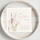 Elegant light cream baby girl shower napkins featuring "a little wildflower is on her way" showcased in a blend of modern grey typography and a whimsical pink calligraphy script, and a boho-inspired watercolor bouquet of purple, pink and yellow wildflowers.