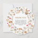 Charming watercolor woodland baby shower thank you design featuring cute forest animals—bunnies, hedgehogs, squirrels, deer, bears, birds—in a whimsical circle with mushrooms, berries, florals, leaves, and soft foliage on clean white background. This enchanting gender neutral theme brings magical nature vibes to express gratitude! Soft hand-painted style with elegant gold "Thank You" text and heartfelt message: grateful for love, gifts, wishes, kind words, and support for your little bundle of joy. Perfect for Boho forest celebrations or woodland nurseries—high-quality printable thank you card to complete your baby shower suite!