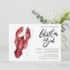 Bil inbjudan till vattenfärgat hummer. Modern penselskriptgrafik "Lobster Boil" (Lobster Boil) med vattenfärgad röd hummer och som samordnar den röda och vita baksidan av rand mönster.