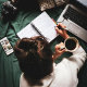 Bok Klubb med glas och kaffe, kaffe Mugg