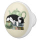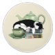 En söt, svart och vit tuxedo-katt som sover på en hög av bokar med en grönt tekanna bakom och kopp längst fram