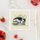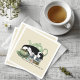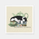 En söt, svart och vit tuxedo-katt som sover på en hög av bokar med en grönt tekanna bakom och en kopp te framför