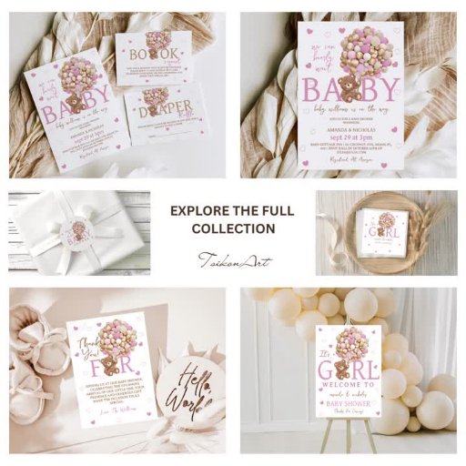 Välkommen flicka med TsikonArts fantastiska barnduschsamling! 🎉 👶 Upptäck vårt charmerande bok-visitkort med en snygg nalle som är kapslad bland mjuka ballonger i rosa, som ställs mot en drömmande bakgrund av rosa i vattenfärgen baby. 🧸 💕 Skapar perfektens ambitioner för er minimala affär mellan stil och Böhmen! 💕 ✨ Låt oss detta värdefulla ögonblick med kärlek och glädje!