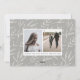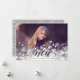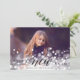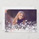 Elegant julkort med ett liggande foto som sträcker sig över hela ytan med en överlagring av bokeh-ljus för en festlig och bubblig look. "Godt Nytt År" är överlagrat i svart skrivstil och blockbokstäver, med ditt/dina namn undertill. Lägg till två ytterligare foton på baksidan, tillsammans med ett anpassat meddelande, på en neutral gråbeige och krämfärgad botanisk mönstrad bakgrund.