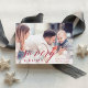 Elegant semestern fotokort med en helsidig liggande fotoframtoning med en bokeh-ljusfläcksöverlägg för en festlig och bubblig look. "Så extremt glad" är överlagt i festlig tranbärsröd script och blockbokstäver, med ditt/dina namn och anpassad hälsning bredvid. Lägg till två ytterligare foton på baksidan, tillsammans med ett anpassat meddelande, på en röd och krämfärgad botanisk mönstrad bakgrund.