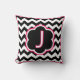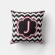 Bokstaven J. Vacker monogram (enstaka initial) kastkudde. Kraftiga svarta och vita sicksack-ränder (chevron), med vita och fuchsia detaljer och en initial i mitten.