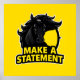 Illustration av en mörk svart hästhuvud ovanför fet text "Gör A Påstående" på pulserande gult bakgrund, som representerar beslutsamhet, styrka och motivation.