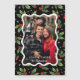 Denna djärva och färgstarka utformning kommer att göra ett minnesvärt påstående i julhelg! Det här festive-kortet har en porträtt-fotomall med djup röd och grönt holly mönster och vågigt vit gräns mot svart bakgrund.