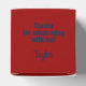 KLASSIFICERING i fetstil, mörk blått bokstäver, radbryts runt framsidan av dessa röda 2-tums fyrkantiga studentfester med ditt namn och tack för ditt meddelande längst upp. Fyll med behandlingar som ett tack till gästerna vid din studentfest. MATCHING-objekt och mer färg i vår samling.