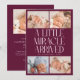 Modern Christmas theme birth announcement card featuring a bold typography text that says "a little miracle arrived" with 4 of your newborn pictures. This is a birth announcement card for the holiday seasons! Add your pictures, birth stats, and a message! The background is cranberry.