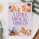 Modern Christmas theme birth announcement card featuring a bold typography text that says "a little miracle arrived" with 4 of your newborn pictures. This is a birth announcement card for the holiday seasons! Add your pictures, birth stats, and a message! The background is purple.