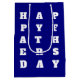 Tre kolonner med fetstilt vitt brev stavar ut Lycklig Fars dag. De hamnar mot en marin blå bakgrund. Modern och minimalistisk utformning.