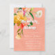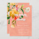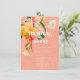 Inbjudningar till Möhippa av Bright- och feta Brunch- och Bubly-blommigtar eller Baby Shower. Blytt och fet blommigt botaniskt arrangemang med färg av gult, persika, nyp och vitt mot en persikokorallkorall, fläckig bakgrund. Underbart för vår, sommar, boho eller trädgårdsbabydusch, möhippa eller tillfälle med brunch och champagne!