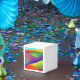 Det digitala vattenfärgslandskapet i vibrerande regnbåge i färg och struktur med kurvformad backe och linjer.