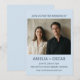 This wedding invitation features a full engagement photo at the top with the couple's names, date, venue, and RSVP details below on a soft blue background in clean bold lettering. Simple, modern, and photo-forward - a great fit for a couple who wants their picture front and center with a calm, understated color palette.